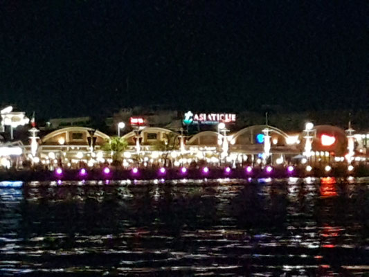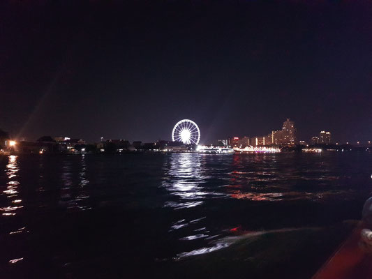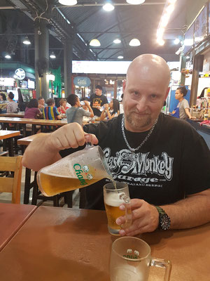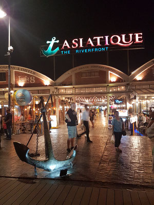 Nach einer kurzen (wirklich sehr kurzen 😉) Pause ging es dann auf die andere Flussseite zum Asiatique Market. Da gab's dann das erste thailändische Essen (sehr scharf und lecker) und das erste thailändische Bier (sehr kalt und lecker). Jetzt sind wir total geschafft und wünschen eine gute Nacht (wir sind hier 5 Stunden voraus).