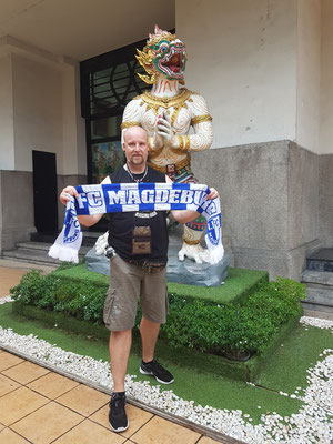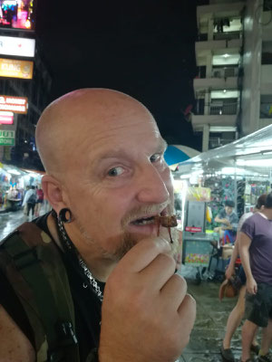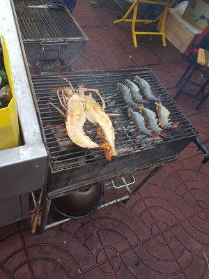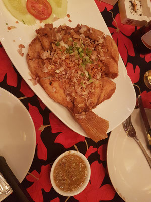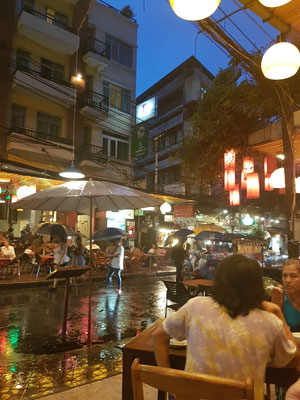 Die Khao San ist das ganze Gegenteil. Hier scheint es ausschließlich Touris zu geben. Viele junge Menschen, die als Backpacker unterwegs sind, alte Männer auf der Suche nach ... und neugierige Touris wie wir 😂. Und hier hatten wir auch den ersten Regen! Also schnell rein ins nächste Lokal und bei nem kühlen Singha und tollem Knoblauchfisch das Ende des Regengusses abgewartet. So schnell wie es losging, so plötzlich hörte es auch wieder auf.