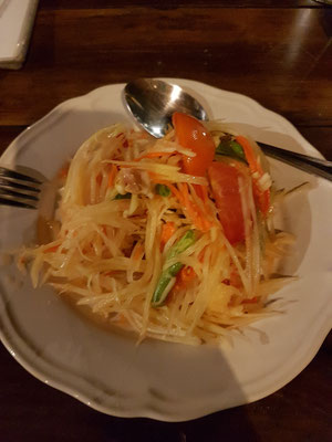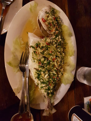Zum Abendessen gab es wieder Fisch, diesmal mit Lemon-Garlic-Chili-Sauce und natürlich den unglaublich leckeren Papayasalat!