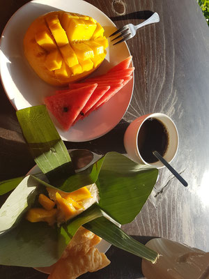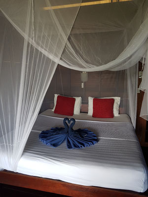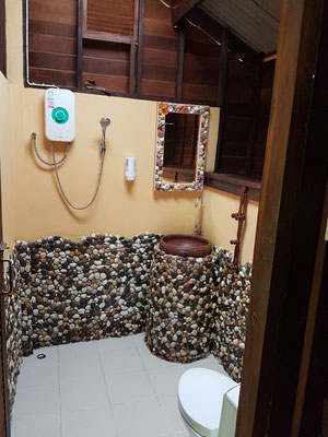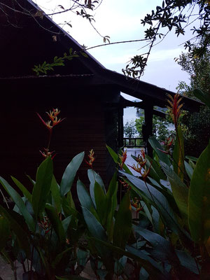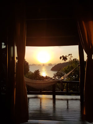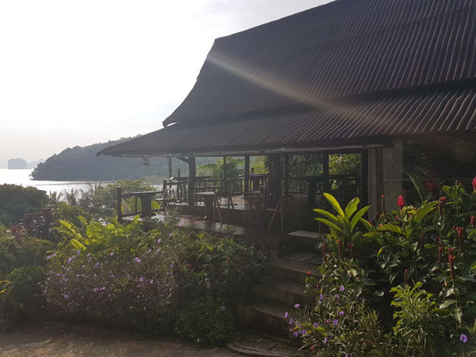 In Koh Yao Noi bewohnen wir eine kleine Hütte in der Anlage Hill House. Sie macht ihrem Namen alle Ehre, die Hütten sind allesamt mitten im Urwald auf Stelzen an einen steilen Hang gebaut. Die gesamte Anlage besteht aus sechs kleinen Hütten und einem kleinen Restaurant. Sie kosten ca. 30,00 €/Nacht. Ausgestattet sind sie mit einem kleinen Bad mit Dusche, mehreren Ventilatoren (keine Klimaanlage), einem Bett mit Moskitonetz und einer tollen Terrasse mit Blick auf die Phang Nga Bucht. Die Zimmer sind inklusive Frühstück, es gibt Obst, Sticky Rice mit Mango, Toast und Marmelade und für einen kleinen Aufpreis kann man sich Eier zubereiten lassen.