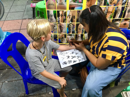 Dafür gabs dann aber für die Heimkehrer (Sani und Gustav) zum Urlaubsende noch ein Henna-Tattoo. Für uns heißt es nun Abschied nehmen von Bangkok. Morgen früh klingelt um 4:30 Uhr der Wecker und dann