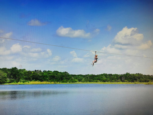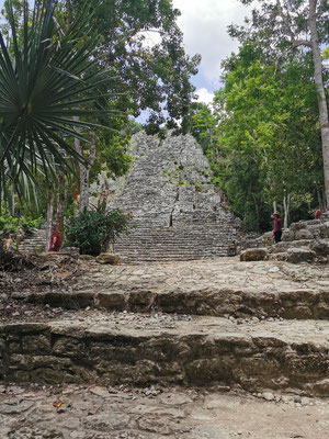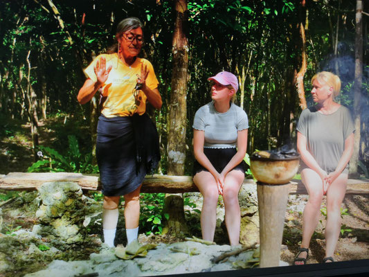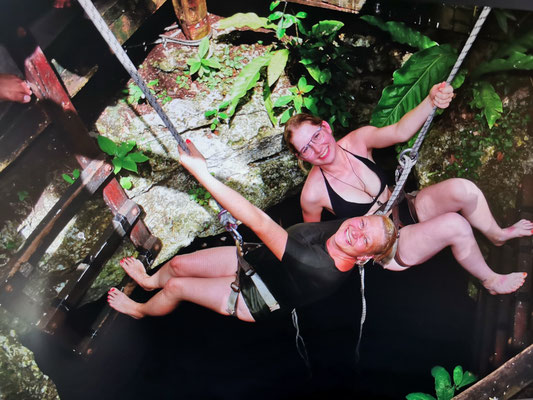 An unserem letzten Tag ging es morgens um 6:30 ins Hinterland von Cancun nach Coba. Auf dem Weg dorthin legten wir einen Stop bei einer Maya Cooperative ein. Hier begann dann das Abenteuer. Nach einer Wanderung durch den Dschungel kamen wir zu einer Cenote. Diese ist unterirdisch in einem Felsen gelegen. Es gibt nur den Weg des Abseilens bzw. einer Strickleiter. Und es geht ziemlich in die Tiefe. Beim runterschauen haben wir kurz überlegt, ob wir einen Rückzieher machen, da es da unten echt dunkel ist und der See ca. 50 m tief ist und somit kohlrabenschwarz erscheint. Aber wir haben uns dann doch dazu entschlossen uns abzuseilen und wir haben es nicht bereut. Neben den verschiedensten Vögeln und Fledermäusen leben in der Höhle im Wasser Katzenfische (das sind die Knabberfische, die alte Hautschuppen von den Füßen abknabbern). Das Wasser ist für mexikanische Verhältnisse echt kalt mit 24 Grad. Es war eine sehr schöne Erfrischung. Raus ging es dann für Marie über die Strickleiter. Ich habe mich entschlossen den "Aufzug" zu nehmen und wurde von den Maya wieder nach oben gezogen (die Armen tun mir jetzt noch leid 🙈 😂). Anschließend ging es weiter durch den Dschungel. Über eine Hängebrücke, zwei Ziplines und mit dem Kanu. Es hat riesen Spaß gemacht! Zur Belohnung gab's dann ein leckeres Mittagessen nach Mayaart. Weiter ging es dann mit dem Bus (wir waren übrigens nur 8 Personen auf dem Ausflug, eine sehr coole Truppe) nach Coba. Dies ist eine historische Mayastätte. Hier haben wir viel wissenswertes über die Bau- und Lebensweise der Maya erfahren. Anschließend ging es wieder zurück auf die Isla Mujeres. Unseren letzten Abend verbrachten wir dann noch einmal im Xantolo bei super guter Livemusik, fantastischem Essen und Cocktails und (!) Tequila. Morgen heißt es dann Abschied nehmen und es geht am Abend wieder Richtung Heimat. Wir freuen uns beide sehr auf unsere Männer, werden aber Mexiko vermissen.