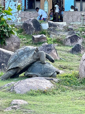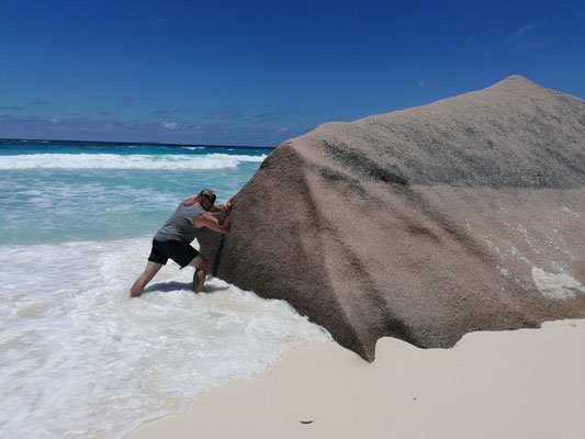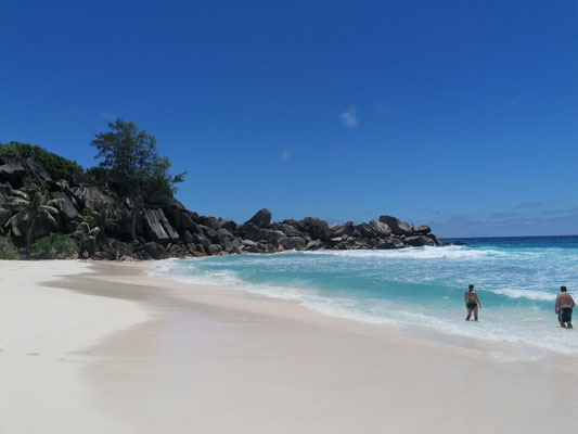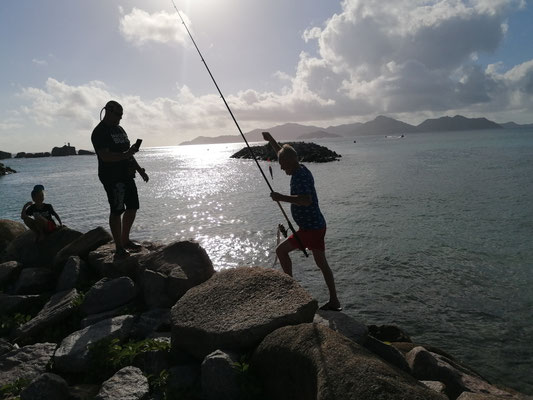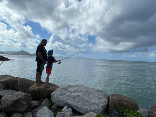 Heute hieß es ab an den Strand. Also haben wir uns auf die Räder geschwungen und sind zur Grande Anse gefahren. Ein wunderschöner Strand, wie alle Strände hier 😉. Hier haben wir uns ein Schattenplätzchen gesucht und den Vormittag verbracht. Ein Abstecher an Simons Fruitbar musste natürlich sein. Schließlich hingen hier Fußballschals aus aller Herren Länder und Peter und Simon hatten somit gleich ein Gesprächsthema. Natürlich gab es einen tollen Frucht Teller und einen Smoothie zur Stärkung und dann hat uns Simon ganz stolz einen deutschen Reiseführer für die Seychellen gezeigt, indem er nicht nur erwähnt wird, sondern es sogar ein Foto von ihm gibt. Der Reiseführer war schon sehr zerfleddert, so viele Touristen haben den schon zu sehen bekommen😊. Am Nachmittag ging es zum Hafen auf die Mole zum angeln. Gustav hat sein Glück versucht und stellt sich richtig gut an. Und für Mike gab's einen Hornhecht. Natürlich kam man auch mit den Einheimischen ins fachsimpeln übers angeln. Es war wieder ein wunderschöner aber auch anstrengender Tag, so dass wir alle zeitig ins Bett gefallen sind.