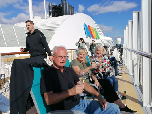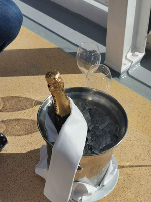 Auf ging es nach Hamburg. Dort war am Hafen großes Einschiffen angesagt. Es war super organisiert, da können sich die Flughäfen in Deutschland ne Scheibe abschneiden. Wir haben unsere Kabinen bezogen und dann hieß es auch schon Abschied nehmen von Hamburg. Natürlich stilecht mit ner Flasche Moét. Danach ging es zum Abendessen und dann haben wir bei einem Cocktail unsere erste Show angesehen. Am Abend sind wir dann ziemlich kaputt ins Bett gefallen.