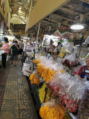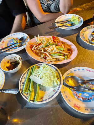 Heute hieß es ausschlafen und erstmal entspannt frühstücken. Danach ging es mit dem Shuttle Boot vom Hotel zum Sathorn Pier und dann weiter mit dem Public Boat bis zur Haltestelle Memomrial Bridge. Von hier sind es nur ca. 5 Minuten bis zum Flower Market. Wir lieben diesen Markt mit den unglaublich schönen Blumenständen, den vielen Gewürzen und den Massen an verschiedensten Obst- und Gemüsesorte. Ein Markt für alle Sinne. Wir ließen uns einfach treiben. Anschließend ging es weiter zum MBK für eine erste (ich bin mir sicher, dass war nicht die letzte 🤣) Shoppingtour. Danach waren wir echt geschafft und haben uns am und im Pool erstmal vom Shoppen erholt. Am Abend ging es dann an die nächste Straßenecke zum Abendessen. Hier haben wir den bisher schärfsten Som Tum gegessen. Puh 😅🌶️🌶️🌶️, super scharf aber auch super lecker. Es brennt alles, man kann aber einfach nicht aufhören zu essen 😂🤣😂.