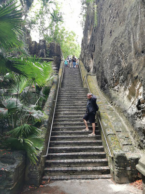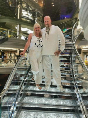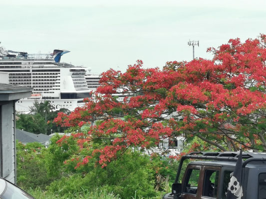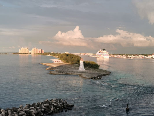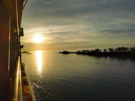 Heute ging es nach Nassau auf den Bahamas. Hier haben wir keinen Ausflug gebucht, sondern die Stadt auf eigene Faust erkundet. Nachdem wir vom Schiff waren wurden wir bereits auf dem Hafengelände von karibischen Klängen und bunten Häusern empfangen. Hier war richtig was los, da 5 Kreuzfahrtschiffe im Hafen lagen und alle Gäste durch das Hafengelände rein und raus mussten 🙈. Direkt nach dem verlassen des Hafengeländes standen wir auch schon vor einem Harley-Shop. Hier konnten wir natürlich nicht dran vorbei gehen. Weiter ging es zu unserem ersten Ziel, den Queenstairecase. Dies ist eine Treppe, die von Sklaven in den Kalkstein gehauen wurde, als Fluchtweg für die oben liegende Festung. Der Weg zur Treppe wird von wunderschön bewachsenen Kalksteinmauern begrenzt. Es war original wie im Tropenhaus 😅. Nachdem wir die 66 Stufen erklommen haben und uns die Festung angesehen hatten, ging es weiter zu unserem nächsten Ziel. Hierbei handelt es sich um Graycliff, hier ist die drittgrößte Weinbibliothek der Welt beheimatet und man hätte eine Weinprobe machen können (das war uns noch zu früh und wir hatten ja auch noch mehr vor 😂). Außerdem werden hier Schokolade und Zigarren hergestellt. Nachdem wir uns hier ausgiebig umgesehen hatten, ging es weiter zur Rum-Destillerie. Auch hier kann man sich umsehen und natürlich den Rum verkosten, was wir auch getan haben. Weiter ging es dann an den Junkanoo Beach, erstmal abkühlen. Es waren nämlich 32 Grad und dazu eine gefühlte Luftfeuchtigkeit von 99 %. Das Meer ist einfach nur herrlich und sooo klar. Am Abend ging es dann langsam durch die Stadt wieder zurück zum Schiff. Nach einer kleinen Erholungspause waren wir beim Abendessen und haben dann das Auslaufen des Schiffs aus dem Hafen beobachtet. Anschließend ging es zur White Night. Das heißt fast alle Gäste auf dem Schiff waren komplett in weiß gekleidet (wir natürlich auch 😅) und haben Party gemacht. Das sah wirklich toll aus und hat richtig Spaß gemacht 😍.