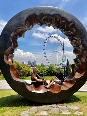 Wir sind gestern 6:00 Uhr in Singapur angekommen. Unser Flug mit Singapur Airlines war super, trotz einem etwas stressigem Umstieg in Zürich. Von 40 Minuten Umstiegszeit sind dank Verspätung nich ganze 20 übrig geblieben und das mit Passkontrolle 😱. Nach anfänglicher Sorge, dass wir den Anschlussflug wohl nicht schaffen werden, wurden wir direkt nach dem Ausstieg empfangen und über das Rollfeld innerhalb von 10 Minuten zur Passkontrolle und dann zum Flugzeug chauffiert. Also VIP-Service 😊. Vom wirklich schönen Flughafen ging es dann direkt ins Hotel. Hier haben wir unsere Rucksäcke angegeben und dann gings weiter Richtung Marina Bay. Wirklich schön und beeindruckend, man sieht alles, was man aus dem Fernsehen kennt im Original. Anschließend gabs in einem Foodcourt noch lecker essen und dann sind wir allesamt (Gusti wäre fast schon beim Essen eingeschlafen 😅) völlig erledigt halb acht ins Bett gefallen.