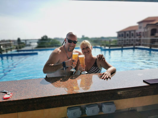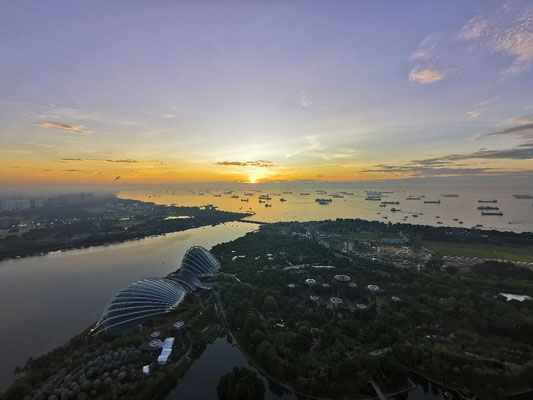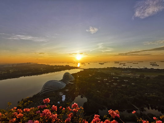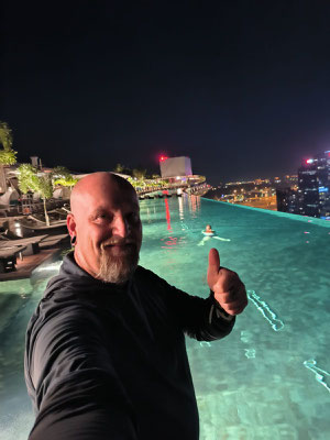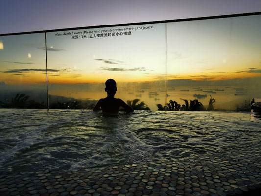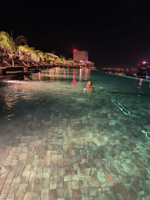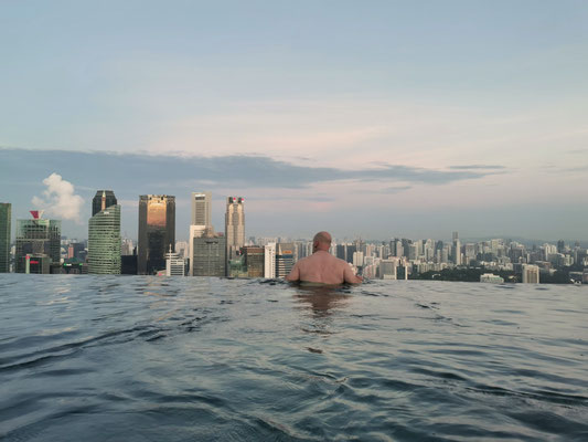 Heute früh hieß es früh aufstehen und dann ab zum Pool. Wir waren am Anfang tatsächlich ganz allein in diesem wirklich riesigen Pool. Hier sind wir entspannt ein paar Bahnen geschwommen und haben dabei die erwachende Stadt beobachtet. Anschlie6sind wir in den Whirlpool um die über dem Hafen aufgehende Sonne zu genießen. Einfach nur schön. Leider war dann die schöne Zeit im Marina Bay Sands schon vorbei. Aber für uns hat es sich gelohnt und wir haben alles richtig gemacht. Wie sagt man so schön: "Meistens bereut man die Dinge, die man nicht gemacht hat."