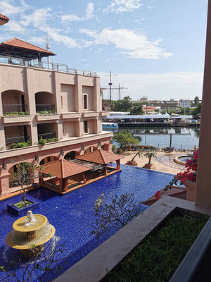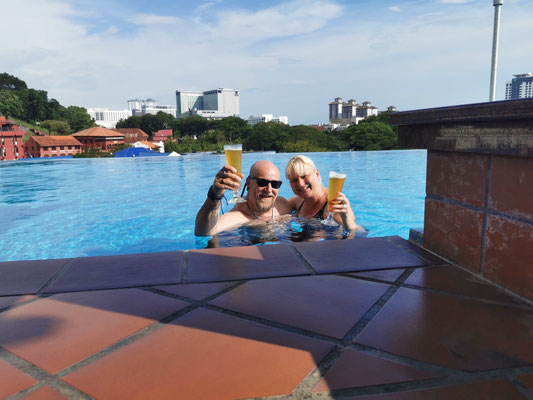 Weiter ging es dann für uns von Singapur nach Malaysia, in die Unesco-Welterbe-Stadt Melaka (oder auch Malacca). Diesmal mit dem Bus und der war echt super komfortabel mit verstellbaren Sitzen, einschließlich Beinstütze und massig Beinfreiheit. Wirklich eine sehr komfortable Reiseart während der wir schon die ersten Eindrücke von Malaysia sammeln konnten. Nach ca. 4,5 Stunden Fahrt (inklusive Aus- und Einreise) sind wir dann in unserem Hotel l Casa del Rio angekommen. Dies befindet sich direkt am Fluss neben der Altstadt. Das Hotel ist wirklich sehr schön und der Infinitipool auf dem Dach hat zu einer Erfrischung eingeladen, dazu noch ein kaltes Bier, einfach perfekt. Am Abend ging es dann in die Altstadt, die ersten Eindrücke sammeln. Uns gefällt die Stadt bisher super. Viele tolle Wandmalereien, unglaublich alte und schöne Häuser, viele Restaurants und Bars. Zum Abendessen gabs dann ein malyisches Chicken devil Curry. Sehr lecker und ist mit Massaman-Curry in Thailand vergleichbar.