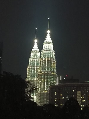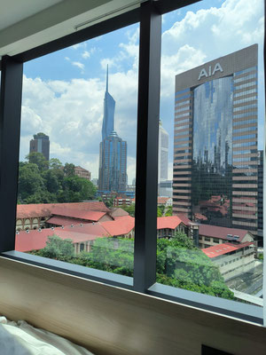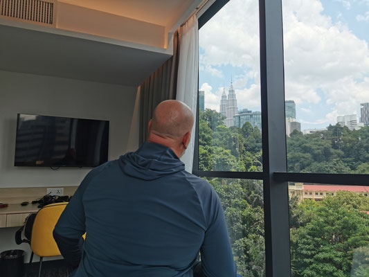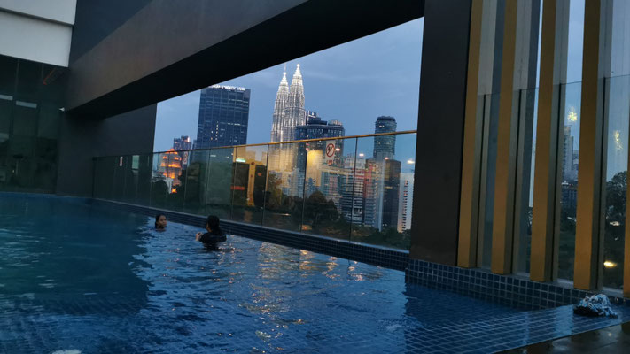 Heute ging es nach dem Frühstück von Melaka nach Kuala Lumpur. Wieder mit dem super bequemen Bus. Die Busse sind hier echt super pünktlich, wir sind sogar eine halbe Stunde zu früh in Kuala Lumpur angekommen. Mit dem Taxi ging es dann zu unserem Hotel, dem Santa Grand Signature. Das ist wirklich schön und wir sehen von unserem Bett aus direkt auf die Petronas-Towers und haben dabei auch die beiden anderen höchsten Gebäude von Kuala Lumpur gut im Blick. Selbst von der Toilette aus, hat man bei bodentiefen Fenstern eine tolle Aussicht 🤣. Nachdem wir uns etwas frisch gemacht hatten, ging es dann zum Harley Davidson - Shop. Das haben wir ja in Singapur bicht geschafft, also war es hier die erste Amtshandlung 😅. Dort angekommen fing es auch schon an zu gewittern, und wie 😱. Aber es gab zum Glück eine Bar und eisgekühltes frisch gezapftes Tigerbeer 😋. Als sich das Unwetter langsam verzogen hatte ging es zurück zum Hotel. Hier sind wir dann ein paar Bahnen im Pool geschwommen umd auch dabei hat man einen herrlichen Blick auf die Petronas-Towers.